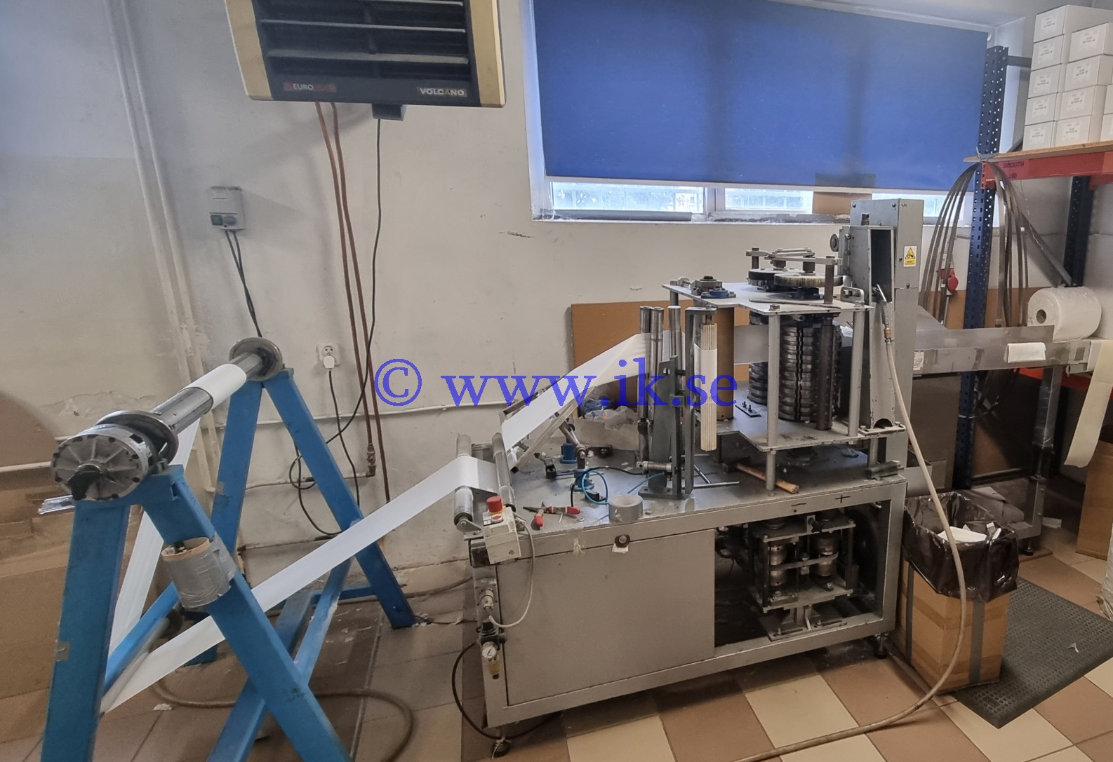 Wipe maker machine to make separate wipes. Max width ingoing roll: 800mm, max diameter: 1000mm. Material is folded in 4, two sets of folding drums (38cm and 42cm), second dimension is determined by input material size, so anything in range 100-800mm. Current set up to make 1/4 crossfold, but it also can make non-interfold Z-fold. Production speed up to 100m/min, depending on material. Machine mainly run Spunlace 50-60gsm and Sontara 60-68gsm.