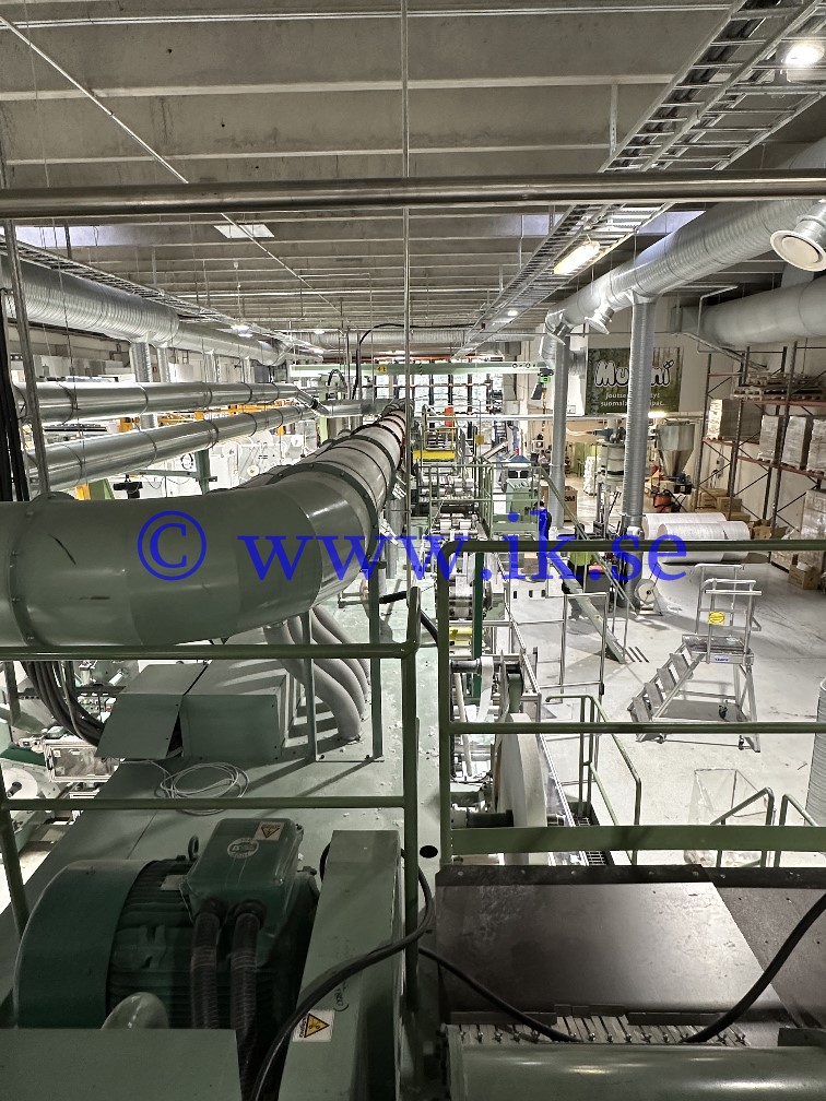 Bi-folding unit, 2nd debulking belt, 90 degree twist conveyor, 3rd debulking belt, curved leg elastic application unit, final heat seal cutting unit, 90 degree turning drum under the heat seal cutter.