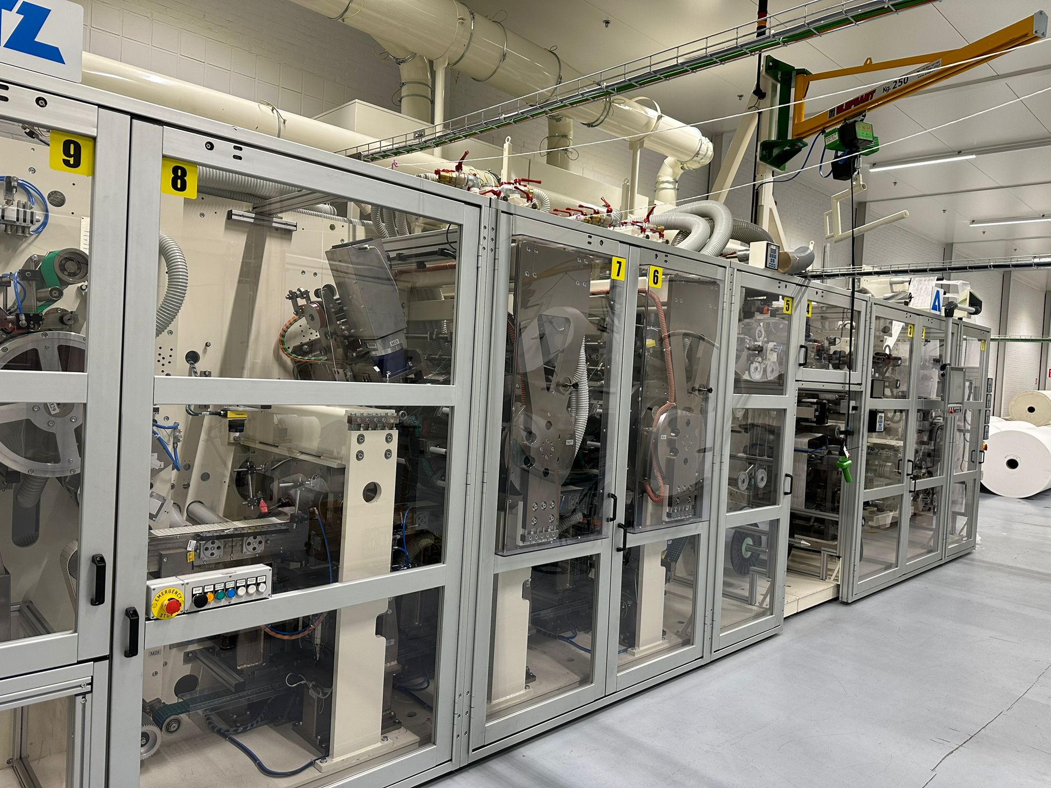 Automatic production line for sanitary napkins with airlaid for Ultrathin Sanitary Napkins with wingsi two sizes: Normal (L=240mm)/ Night (L=280mm). Prduction speed 600 pcs/min (for normal size).