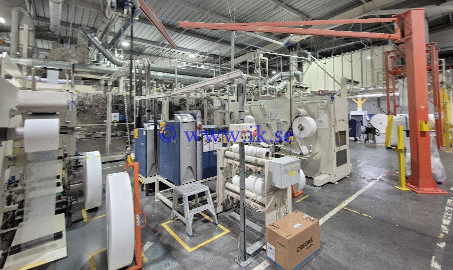 Adult-pants line, left hand orientation, sizes Large and XL, speed 210 ppm/170 m/min for L and 190 ppm/175 m/min for XL, Nordson VersaBlu melters added in 2019, Eichele cutting units, with Optima LS4 stacker, transfer pusher and Optima OS-5 bagger with compression, 8/10/12/14 pieces (both L and XL), and 28 cycles on the smallest size - at highest speed.